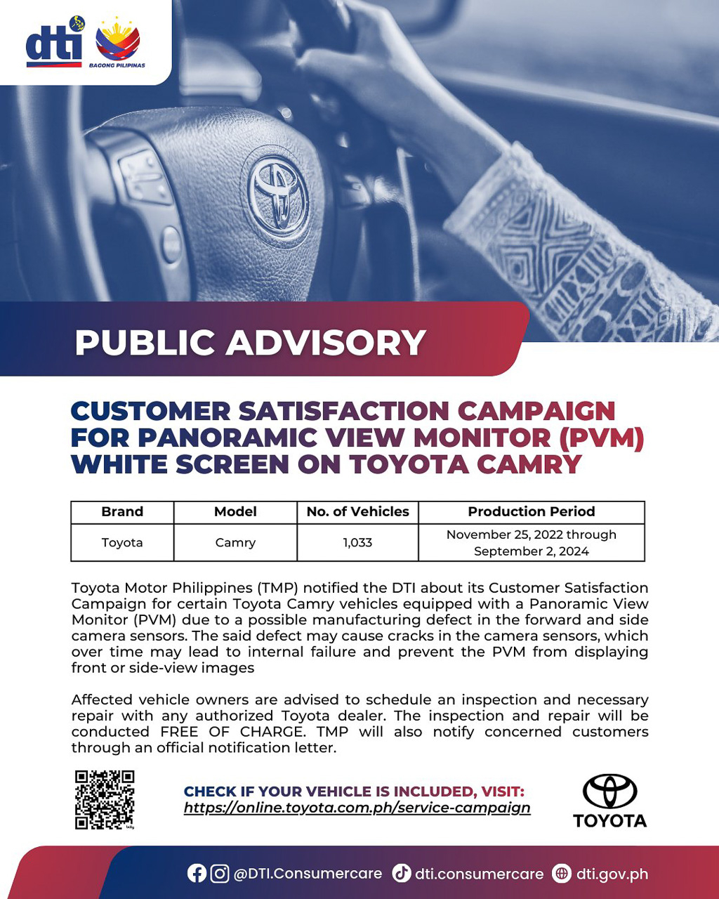 Toyota Motor Philippines (TMP) has just notified the Department of Trade (DTI) of its Customer Satisfaction Campaign (AKA recall) for certain Camry vehicles equipped with a panoramic view monitor (PVM) system due to a possible manufacturing defect.