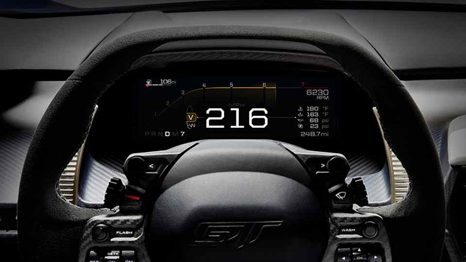 "Driver focus and attention are key with such high performance. We’ve designed the GT with a sleek digital instrument display that changes depending on driving mode in ways that are important and usable to the driver," said Jamal Hameedi, chief engineer of Ford Performance.