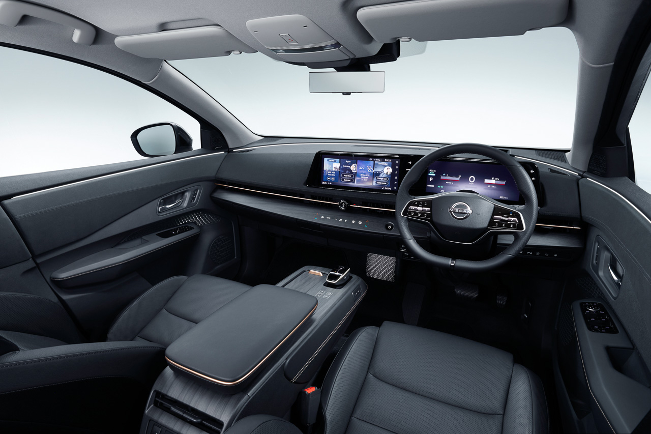 Similar to the exterior, the interior has mostly been carried over from the concept featuring a minimalist design. Inside the cabin, the first thing you'll notice is the large digital display which has both the infotainment screen and instrument cluster integrated together. To keep with the minimalist design, there are barely any physical buttons on the dashboard. The center console is also separated from the dashboard, freeing up space in the front row. Thanks to the new platform underpinning the Ariya, it gets a very spacious flat-floor cabin.