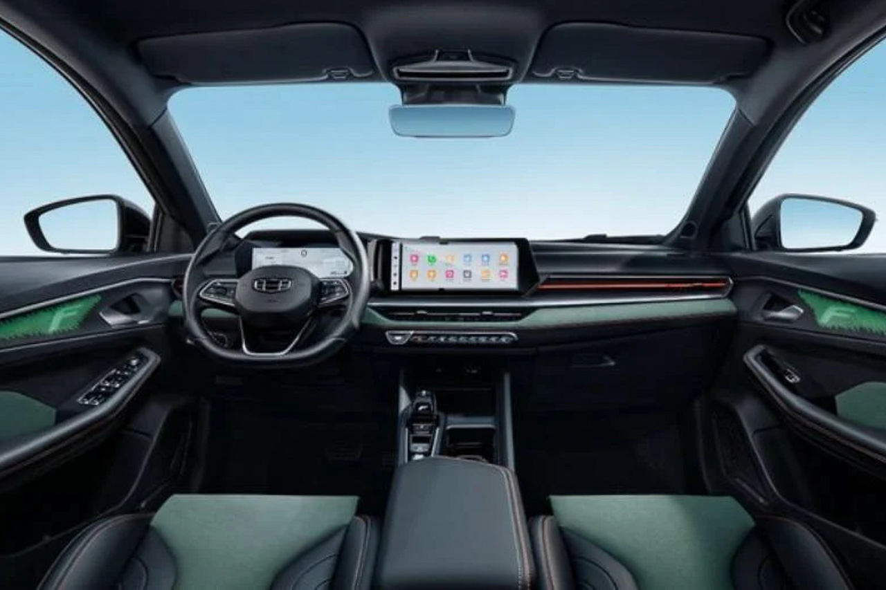 The rear end gets a spoiler and smoked LED taillights connected by a horizontal black trim piece with GEELY on it. Once you look down, you'll notice the dual oval-shaped exhausts sticking out of what looks like a rear diffuser.