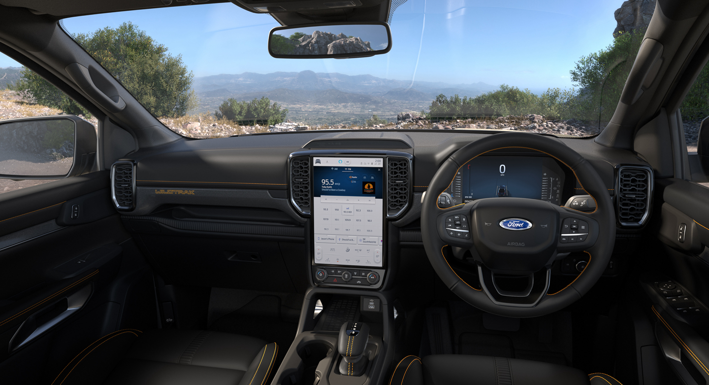 Step inside and you'll be greeted with a black and gray cabin for regular Ranger variants, while orange contrast stitching is added for the Wildtrak. There's a combination of leather and synthetic leather upholstery for select models, and for the first time, second-row air conditioning is offered as standard equipment.