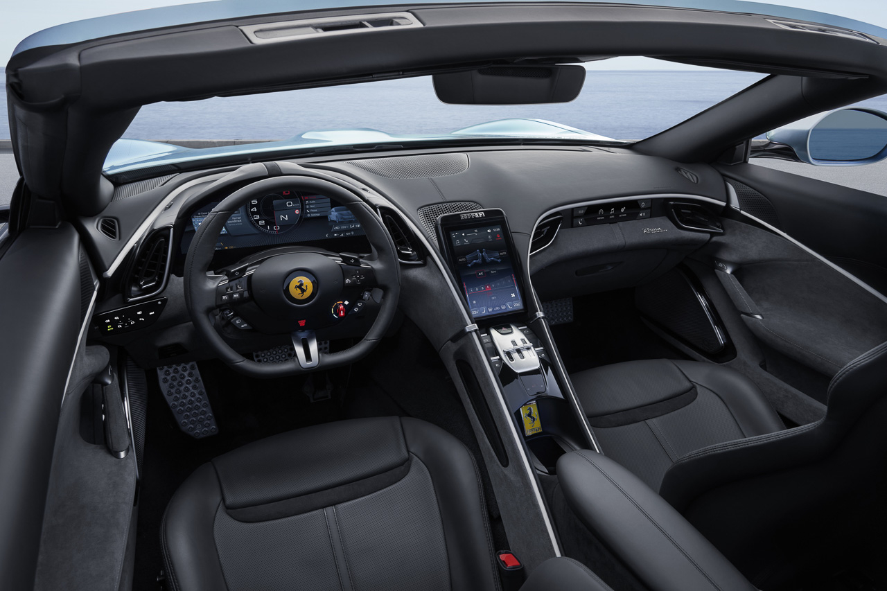 In the cabin is a 2+2 layout with two distinct spaces, driver and passenger, which is in line with Ferrari’s dual-cockpit concept. Both front passengers have a module each that wraps around them while extending and integrating with the two rear seats. In front of the driver is a digital instrument cluster with an anti-glare binnacle that extends out naturally from the dash.