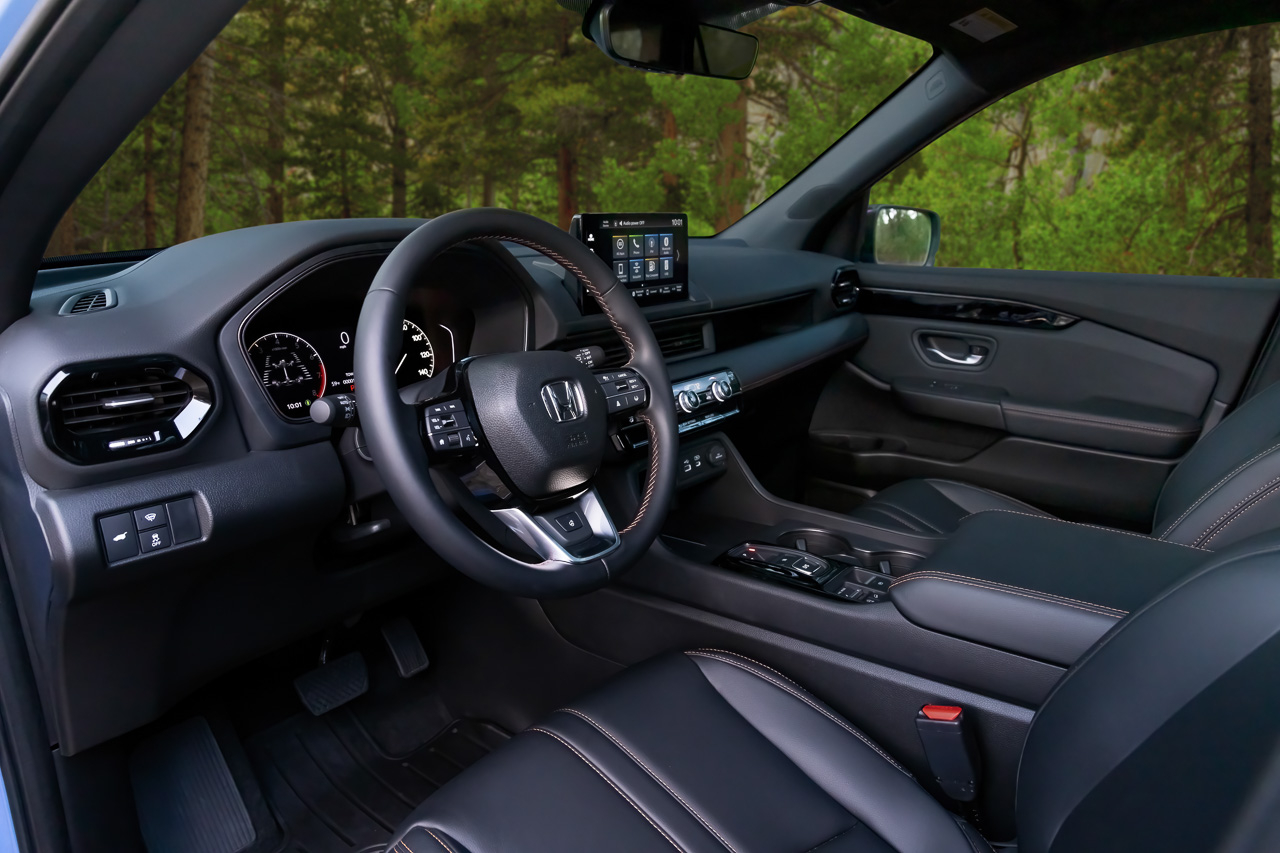 The Pilot also comes with the digital instrument cluster first seen in the all-new Civic, along with the three-spoke leather-wrapped steering wheel that’s becoming a common sight among new Honda vehicles. Other interior amenities and features include generous piano black trim, full-leather upholstery with contrast stitching, a panoramic sunroof, a 9-inch (or 7-inch) touchscreen with Apple CarPlay and Android Auto, and ventilated front seats.