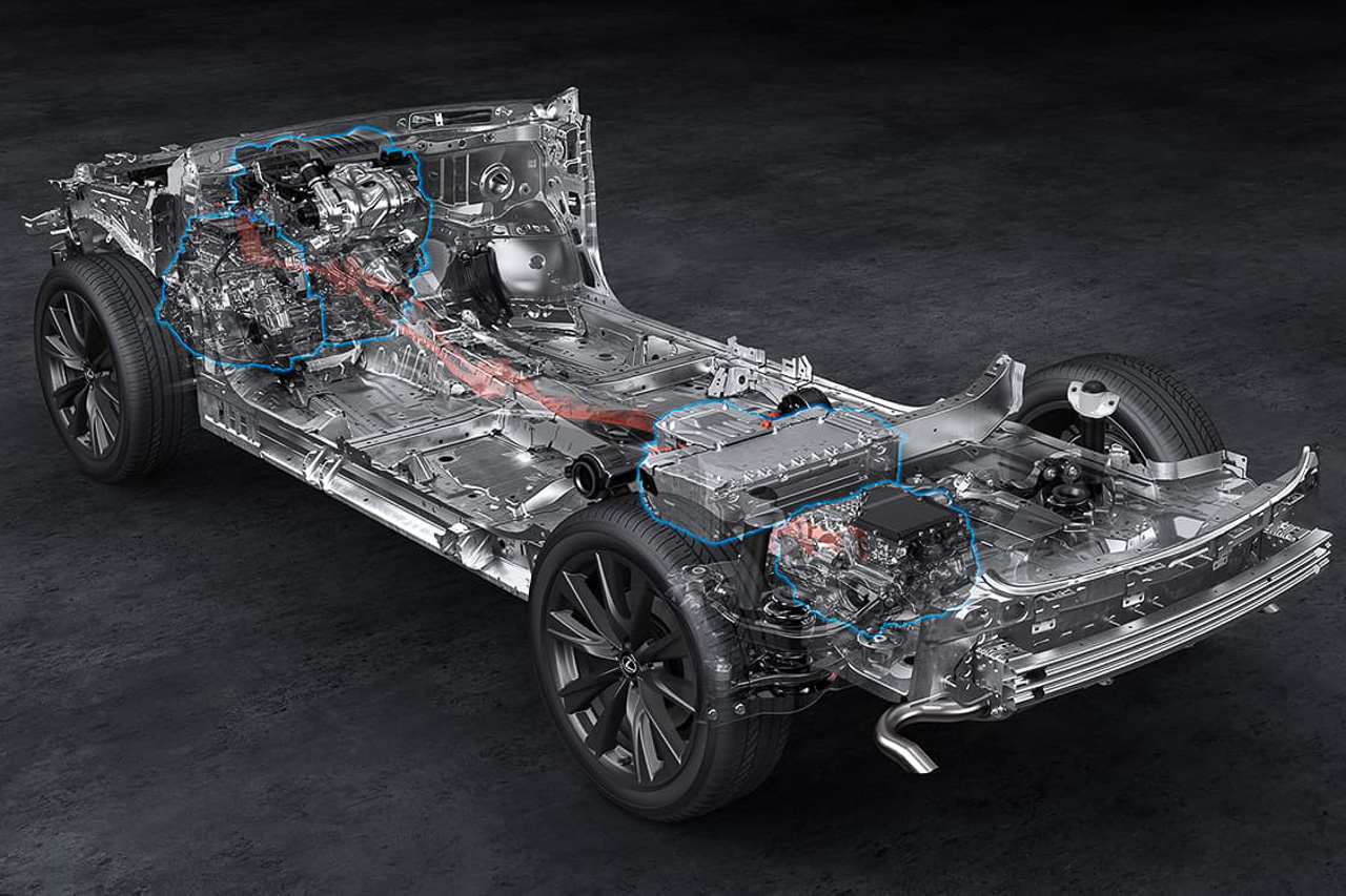 At the heart of the RX 450h+ is not a turbocharged four-cylinder. Instead, it's actually a 2.5-liter naturally-aspirated inline-four that's helped along by a pair of electric motors and an 18.1-kWh lithium-ion battery pack. It has a combined system output of 304 PS and benefits from E-Four electric all-wheel drive thanks to the rear-mounted electric motor.