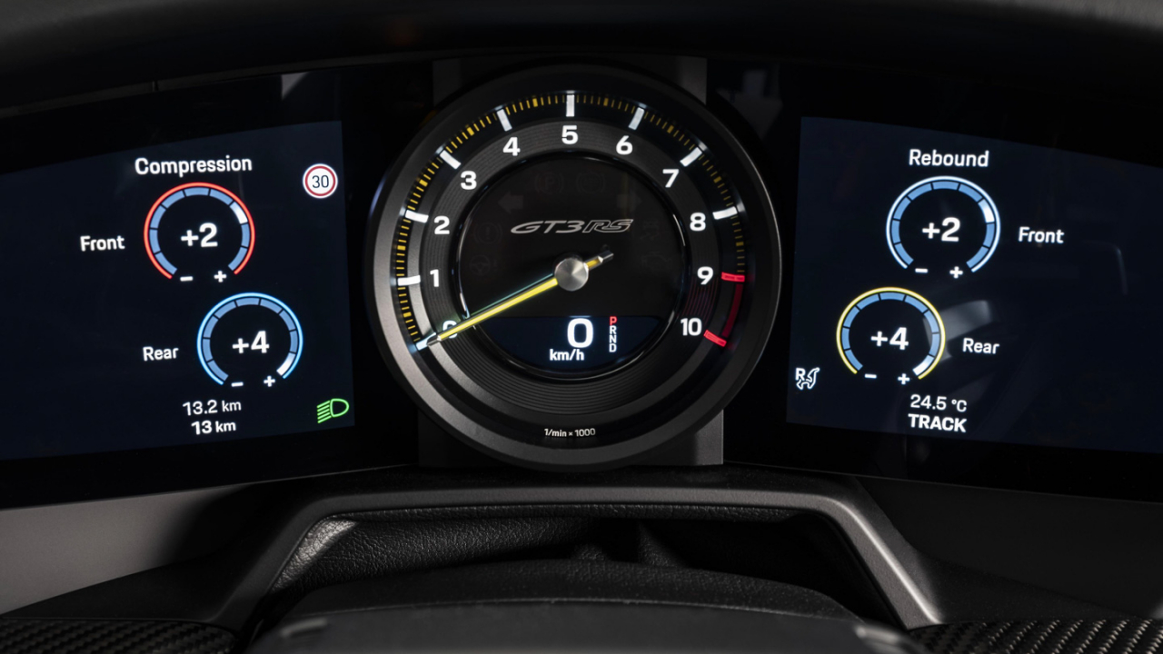 Inside the GT3 RS has a pair of carbon-fiber bucket seats, and for some markets, a steel roll cage. It's not a complete departure from the GT3, but the RS gets additional gadgets like knobs for its three driving modes, plus settings for motorsport-borrowed stuff like rebound and compression damping for the suspension and rear differential tuning.