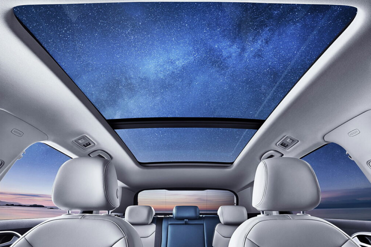 Other interior features present in the 2023 Tharu include LED ambient lighting, a two-tone cabin finish, leather seats with contrast stitching, gloss black trim pieces, a large panoramic sunroof, and touch-sensitive controls on the steering wheel.