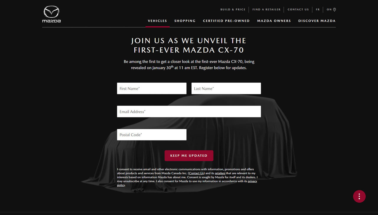 Soon though, Mazda's lineup of large crossovers will be joined by another model, the CX-70. It's set to be revealed on January 30 and Mazda Canada already has a dedicated website for the upcoming vehicle.