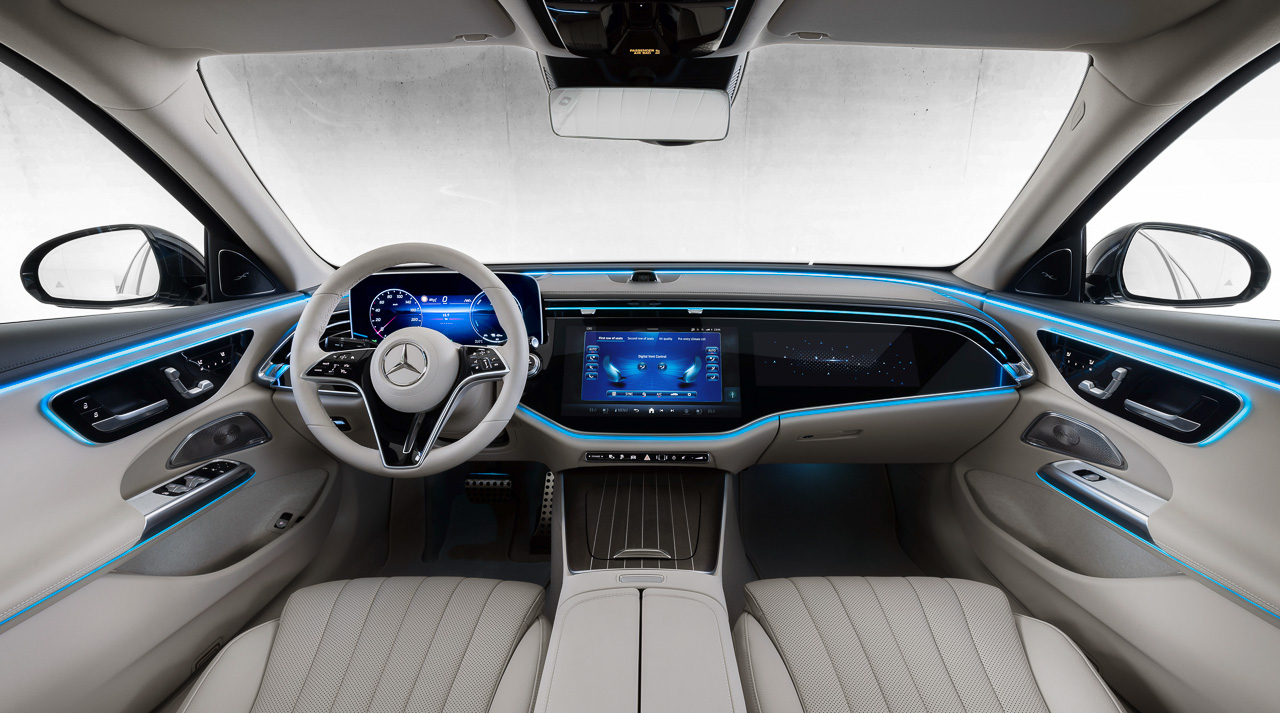 Like the all-electric EQE, the 2024 E-Class shares a similar dashboard. As a result, the sedan is equipped with a free-standing digital instrument cluster along with a massive MBUX touchscreen infotainment system. And if that's not enough, there's an optional touchscreen for the front passenger to take the strain away from the driver.