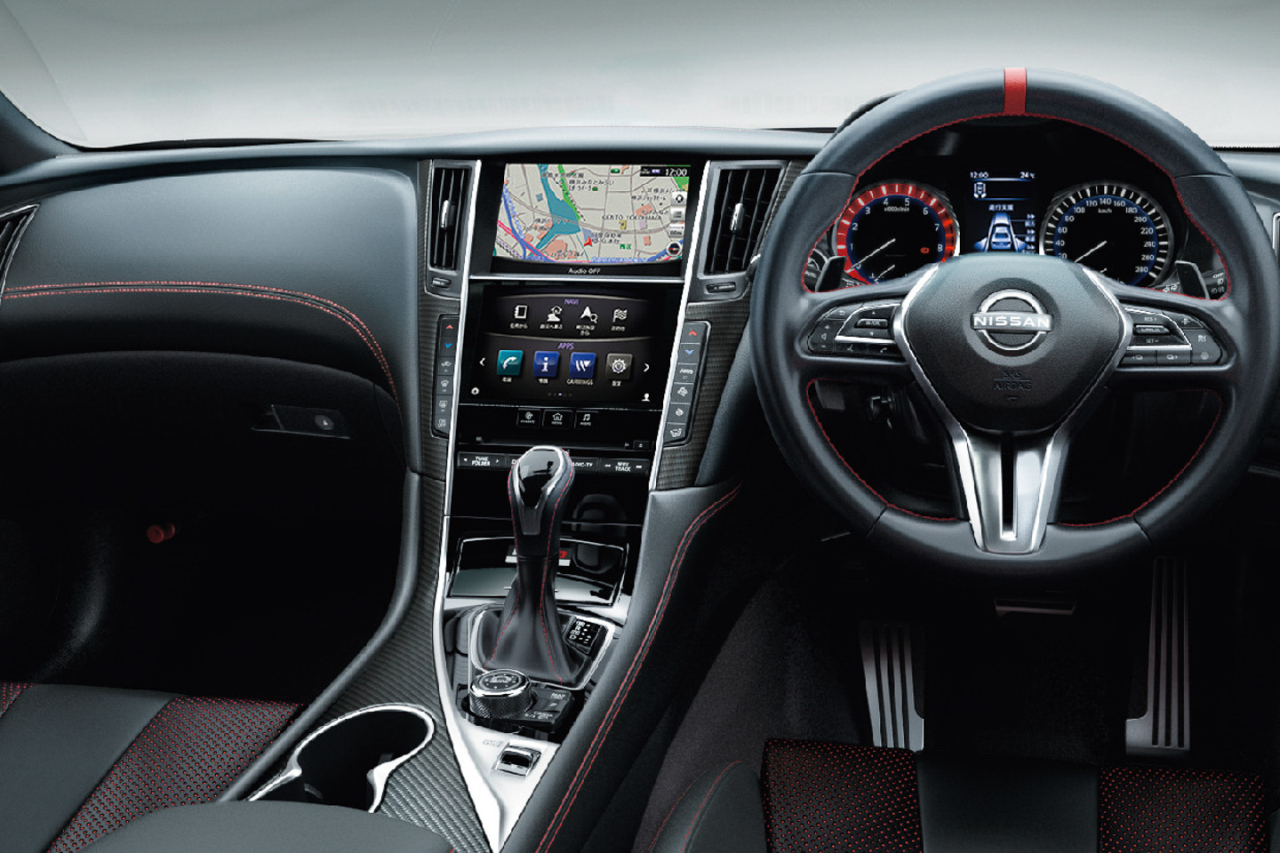 Inside, the Skyline NISMO has an interior designed for grand touring, ensuring high levels of comfort but at the same time keeping occupants in place during high-speed applications. The cockpit features a leather-wrapped steering wheel with the usual NISMO red center mark.