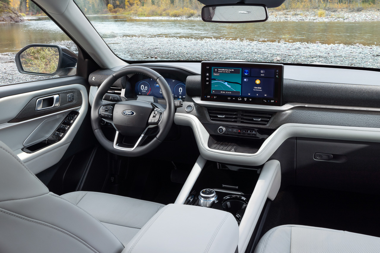 Hop inside and the interior of the 2025 Explorer gets a heavily restyled dashboard that aims to provide more space for the driver and front passenger. There's a new 13.2-inch touchscreen infotainment along with a 12.3-inch digital instrument panel. The former comes with the Ford Digital Experience system and supports wireless connectivity for both Apple CarPlay and Android Auto. The touchscreen also supports mobile gaming while the instrument cluster can now display the map in real-time.