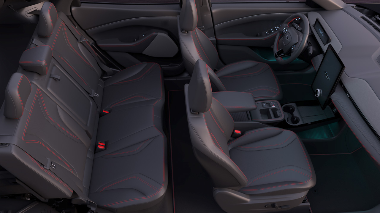 This gives the Mustang Mach-E features such as enhanced voice recognition and wireless Apple CarPlay & Android Auto. Also available is a 10-speaker Bang & Olufsen sound system with subwoofer, an auto-dimming rearview mirror, a wireless charging pad, and dual-zone climate control with rear vents.