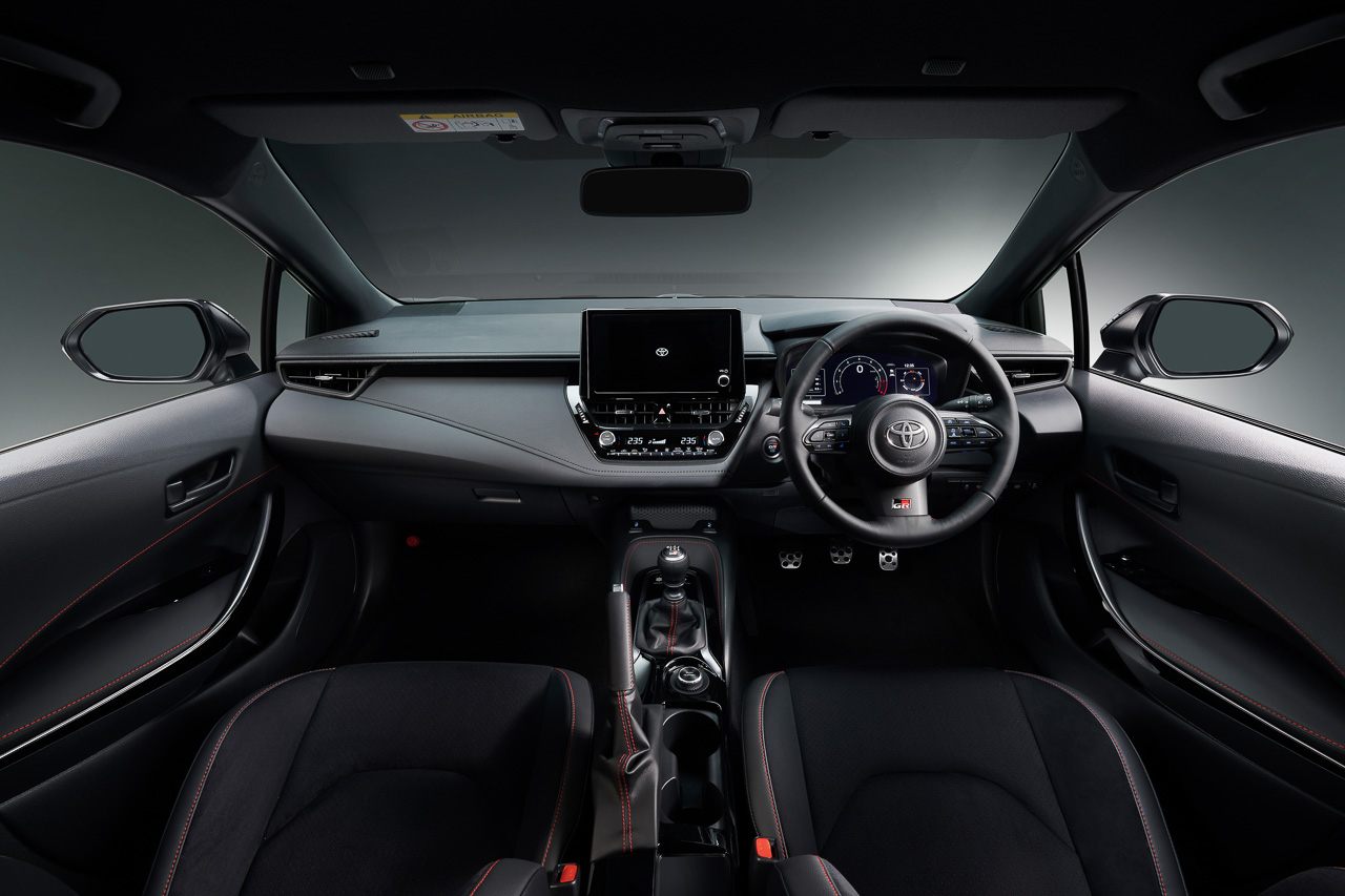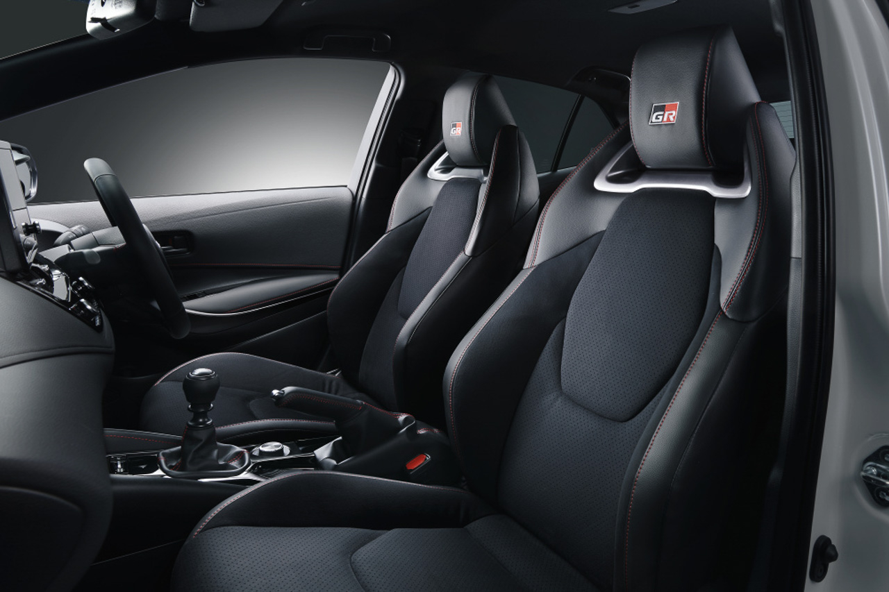 Inside, the occupants are treated to a race-inspired interior complete with GR leather-suede sport seats, a three-spoke leather steering wheel, GR-badged headrests, and a short-throw shifter. There's also a 12.3-inch digital instrument cluster, a 7-inch touchscreen infotainment system with Apple CarPlay and Android Auto, a wireless charger, and 7 airbags. For extra peace of mind, Toyota Safety Sense 3.0 comes standard on the GR Corolla.