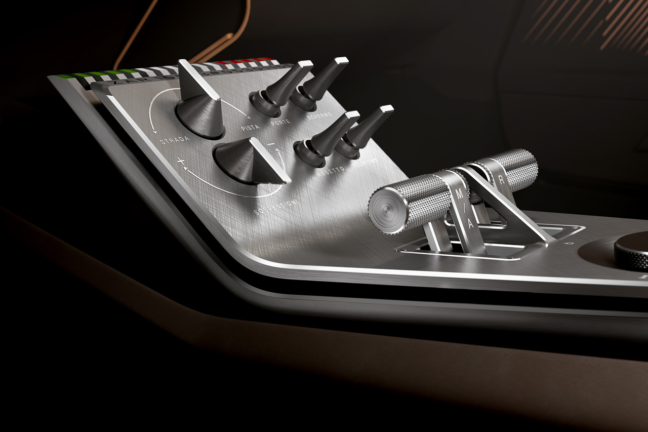 The cabin is bare except for its 3D digital instrument cluster and an aluminum center stack with physical switches to handle the front-axle lift, launch-control system, and other features of the 33 Stradale.