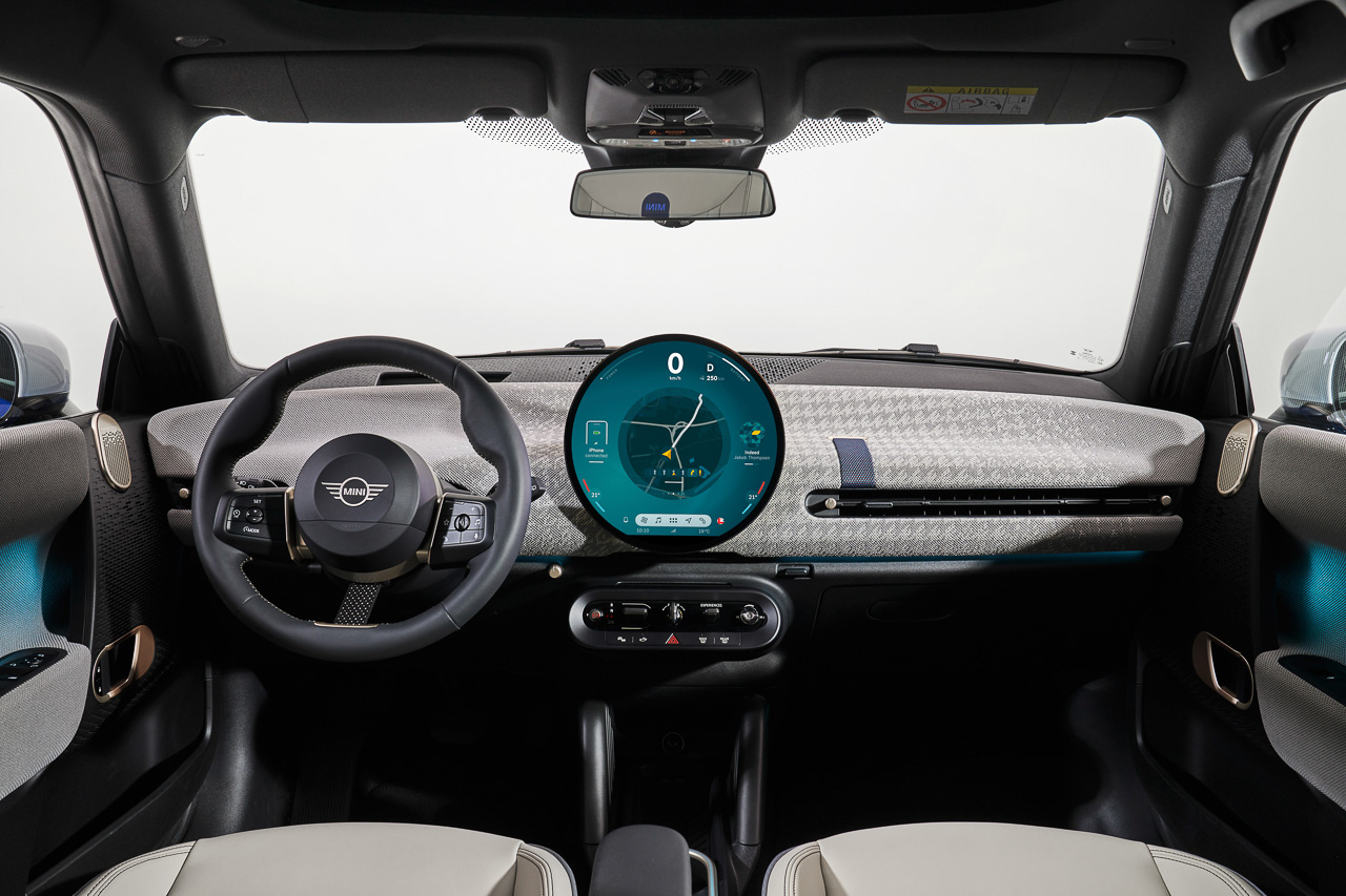 Inside, it has a central OLED display and the Interaction Unit. Passengers can access its features by saying the words “Hey Mini”. It has a wireless charging pad and a newly designed reduced toggle bar with five switches, which includes all driving functions. The gearshift has been eliminated to create additional storage space between the front seats. All trims of the all-electric Mini Cooper feature seats in high-quality Vescin artificial leather, while all textiles and yarns for the seat, knitted surfaces, vehicle headliner, and floor are made from recycled materials.