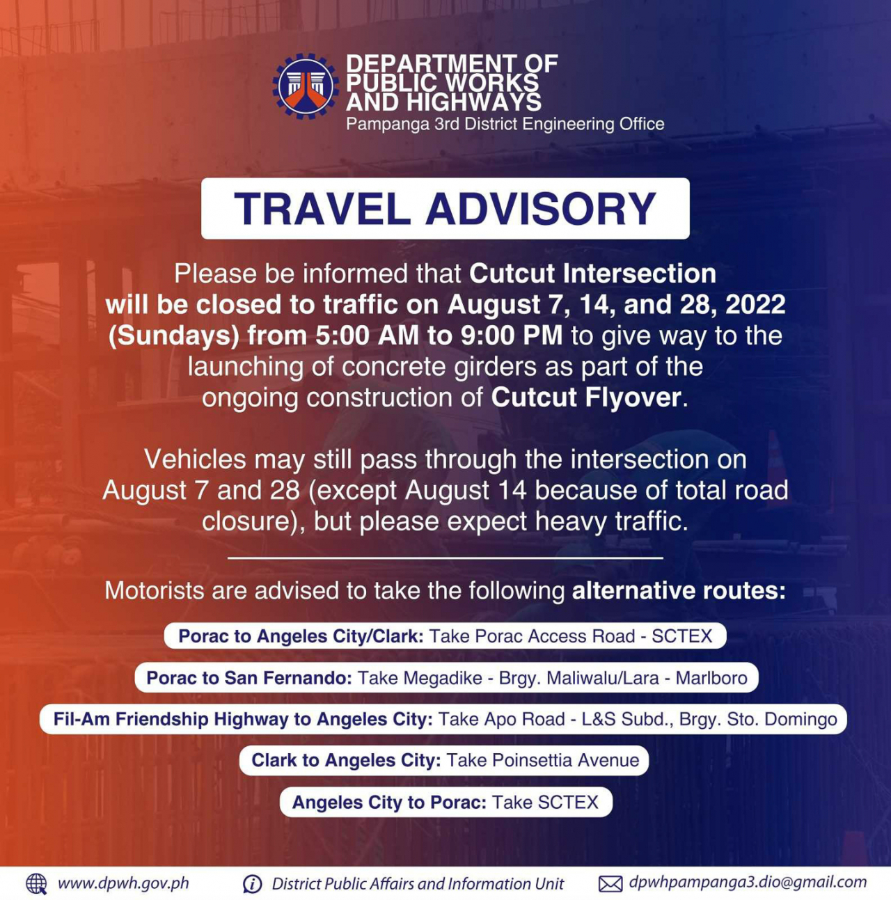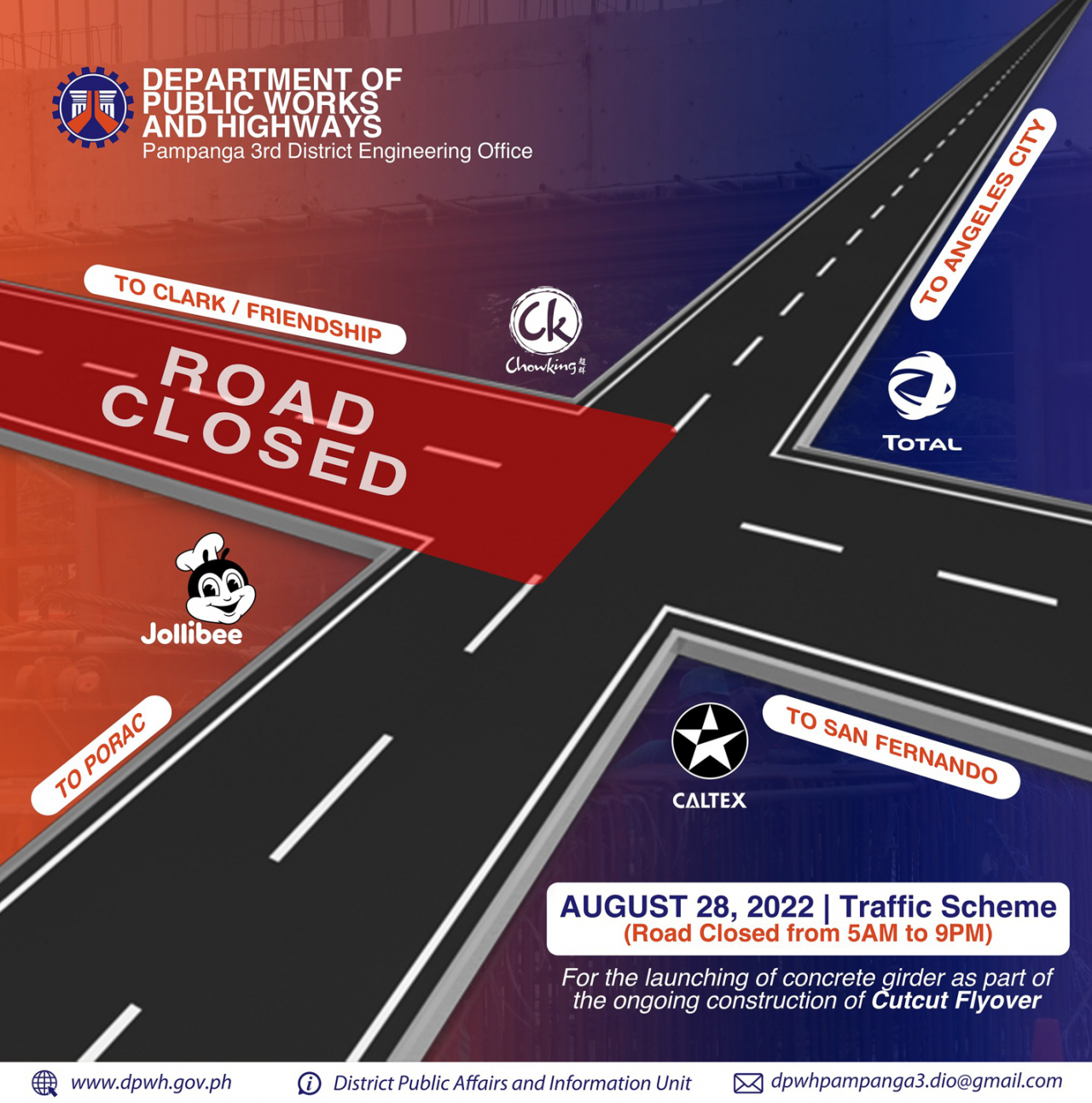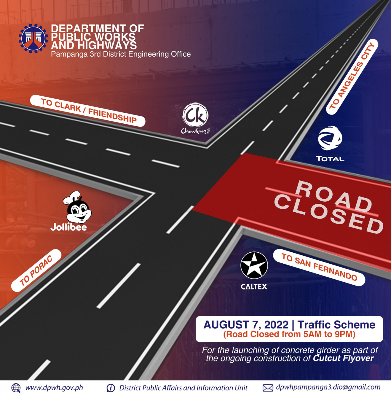 The Department of Public Works and Highways (DPWH) will be closing down the Cutcut Intersection from 5:00 AM to 9:00 PM on August 7, 14, and 28 (all Sundays). The road closure will be done to launch the concrete girders on the Cutcut flyover that is being constructed in the area.