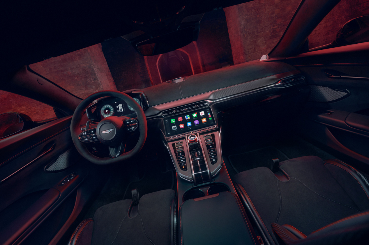 Inside, there’s more Alcantara trims and carbon fiber elements to show that it’s indeed a hotter Vantage. There are embroidered S logos on the seats, and as part of Aston Martin’s personalization options, there’s model-specific embroidery and a choice of red or silver anodised finish to the knurled metal drive mode rotary gear selector.