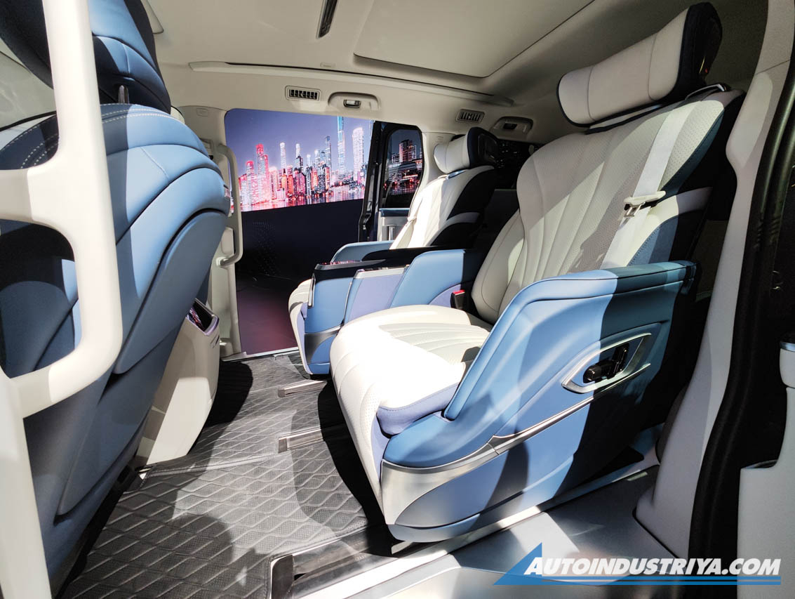 As with any luxury minivan, the main feature are the dual motorized sliding doors to give access to the rear cabin. The rear seats are as expected of an Alphard-like minivan with motorized adjustment, elaborate upholstery, and more. We spotted a sunroof in the back but didn’t spot if it had a motorized ottoman/leg rest; that might be specced for later. There is also a third row in the back.