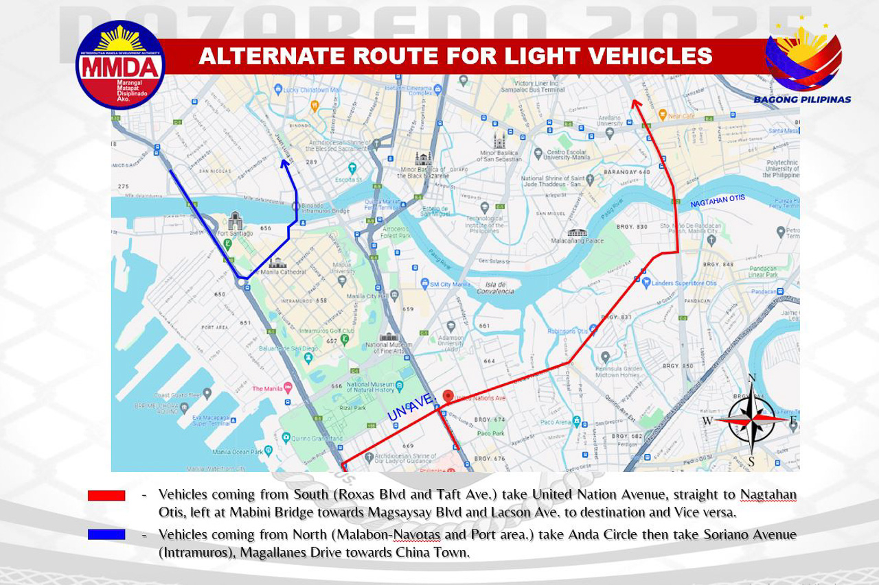 According to the Metropolitan Manila Development Authority (MMDA), for vehicles coming from the south (Roxas Boulevard and Taft Avenue), take United Nations Avenue, straight to Nagtahan Otis, left at Mabini Bridge towards Magsaysay Boulevard and Lacson Avenue to destination, and vice versa.