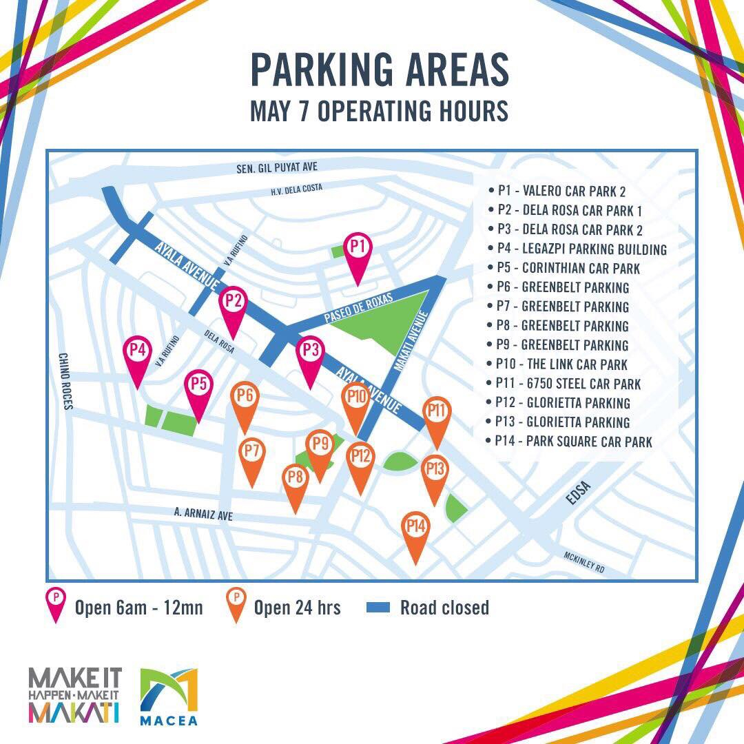 From May 6, 9:00 PM to May 8, 6:00 AM, a large section of Ayala Avenue and the surrounding portions of Paseo De Roxas and Makati Avenue will be closed to traffic. To be specific, these are the affected areas shared in the Make It Makati page.