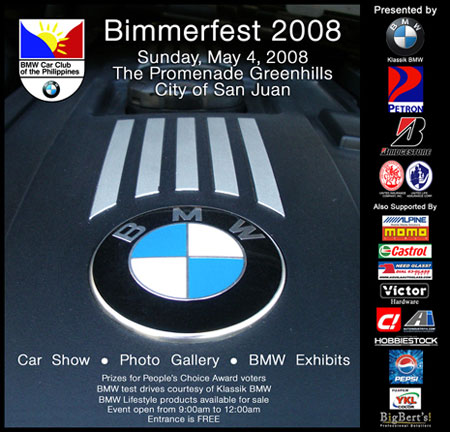 BMW Car Club of the Philippines proudly presents the Bimmerfest 2008, the ultimate BMW experience, a thrilling and exciting all-BMW Automobile car show to be held on Sunday, May 4, 2008 at The Promenade Parking lot, Greenhills, San Juan.