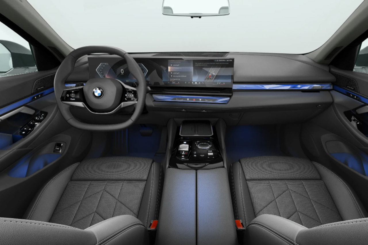 The new BMW 520i presents a perfect fusion of style, comfort, and cutting-edge technology, positioning it as an ideal choice for the discerning driver. Its commanding presence starts from the exterior, available in four elegant color options: Alpine White, Black Sapphire, Cape York Green, and Oxide Grey. Accentuating its dynamic design are 18" light alloy wheels, sharp LED headlights, and the refined shimmer of the Aluminum Satin Finish exterior trim, ensuring it turns heads at every corner.