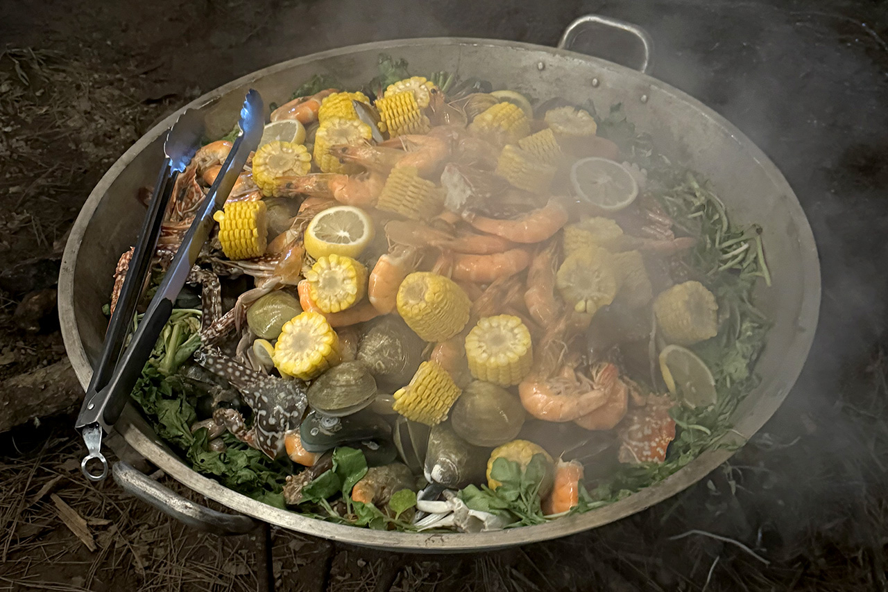 During the drive going up, my carmates and I were talking in jest about maybe there should be seafoods since it would not be readily available in the mountainous region. Lobsters were talked about and I remembered Marvin of Marv’s Boqueria was with us during the trip. Lo and behold, a wok full of clams, mussels, shrimps, and crabs was on site.