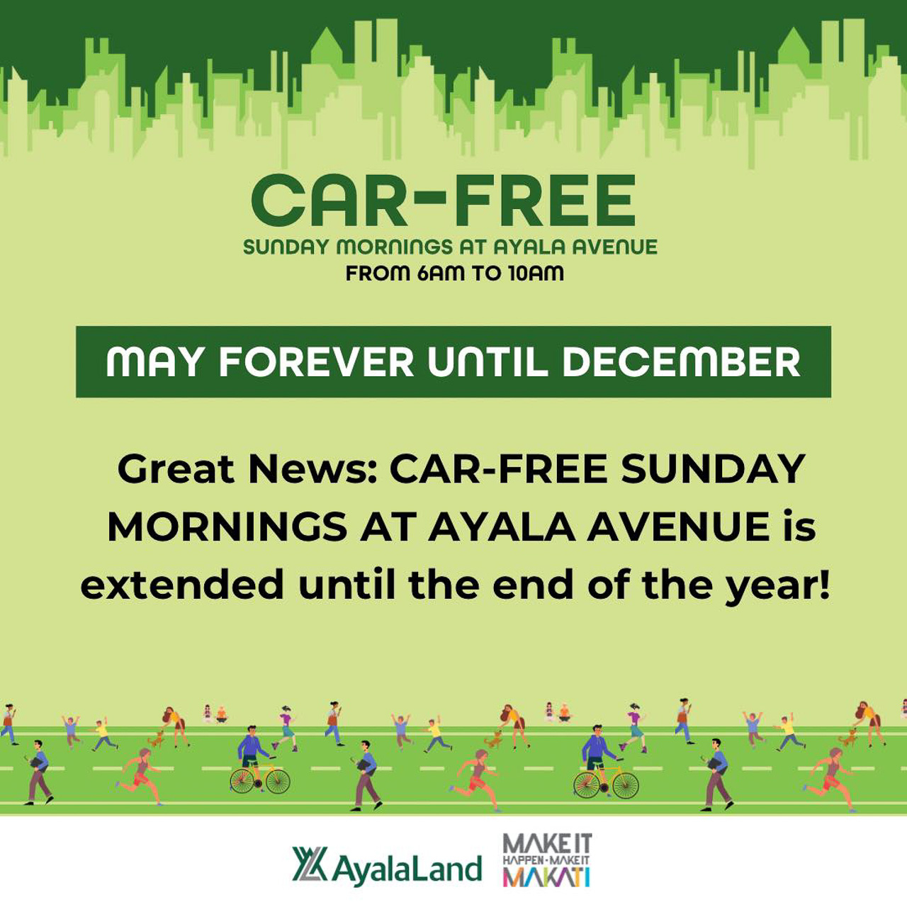 In case you have yet to experience a car-free Sunday along Ayala Avenue, you'll have until the end of 2023 to enjoy your morning walks or exercises along the said avenue.