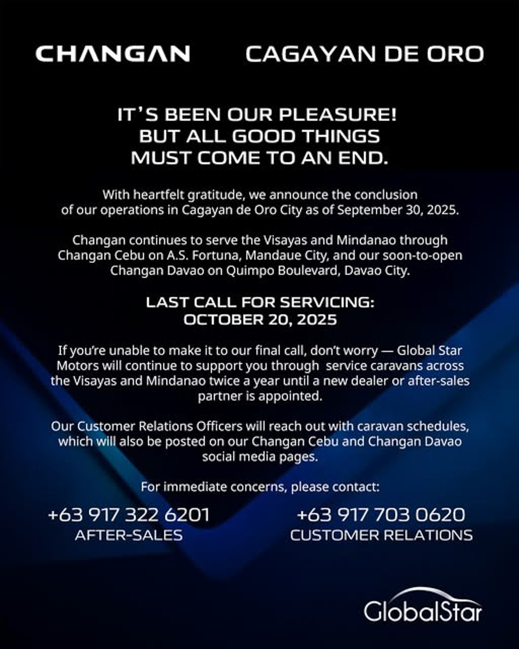 “With heartfelt gratitude, we announce the conclusion of our operations in Cagayan De Oro City as of September 30, 2025. Changan continues to serve the Visayas and Mindanao through Changan Cebu on A.S. Fortuna, Mandaue City, and our soon-to-open Changan Davao on Quimpo Boulevard, Davao City,” said the automaker via a statement.