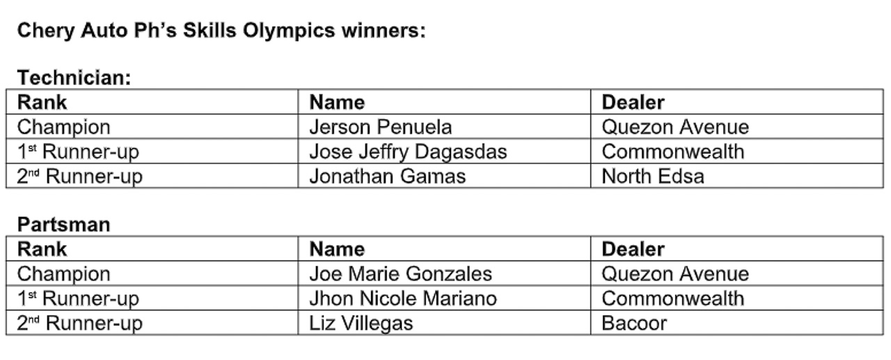 The winners of the first-ever Chery Auto PH Skill Olympics are as follows:
