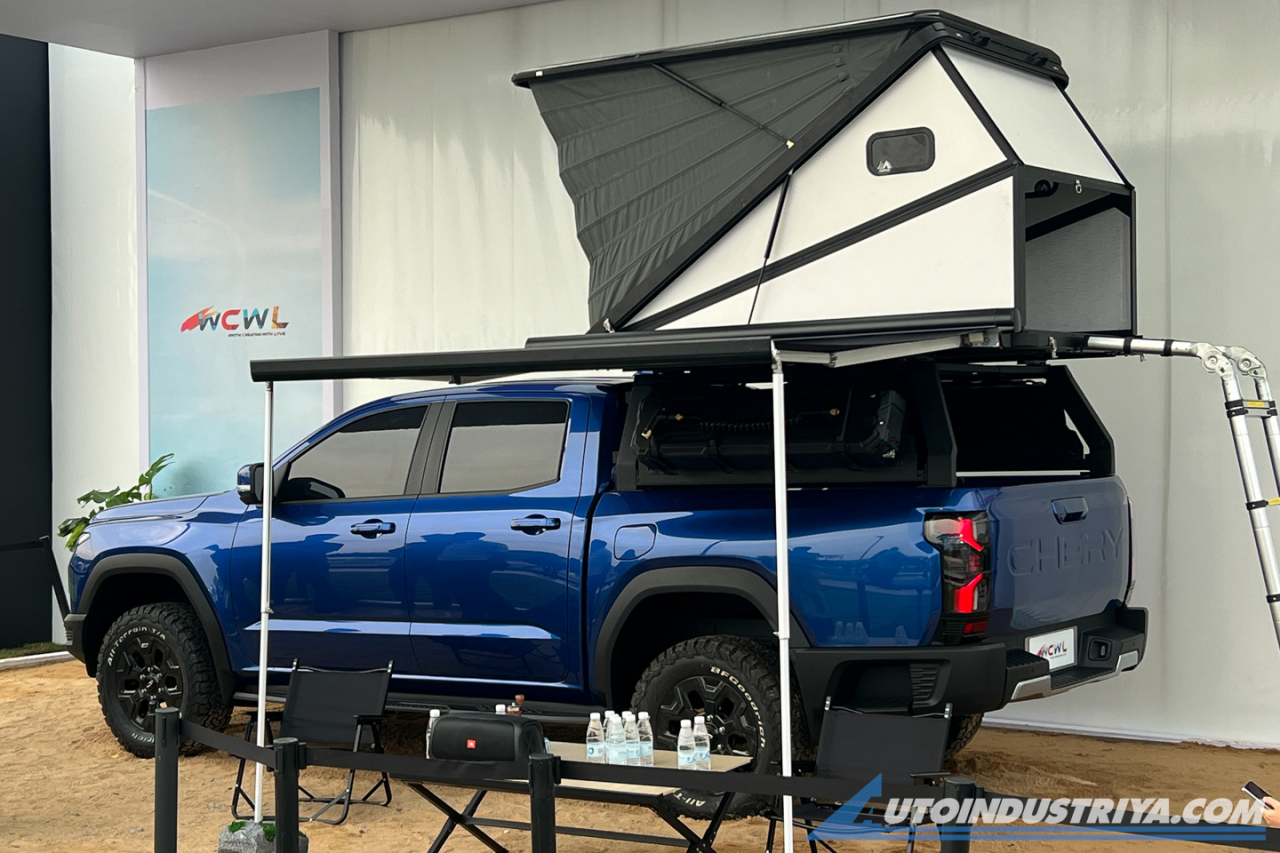 Chery hasn’t released any details regarding size, wheelbase, and ground clearance, but it seems to be bigger than many competitors; probably similar in size to the current Ranger. The model shown features a roof top tent and awning, but we can see that the vehicle comes with thick grip door handles, a generous side step, black wheels are wrapped in BFGoodrich all terrain tires, and a rear bumper that also has the side step similar to the Ranger as well. Just like the front, Chery is shown very proudly on the tailgate, albeit stamped in the metal.
