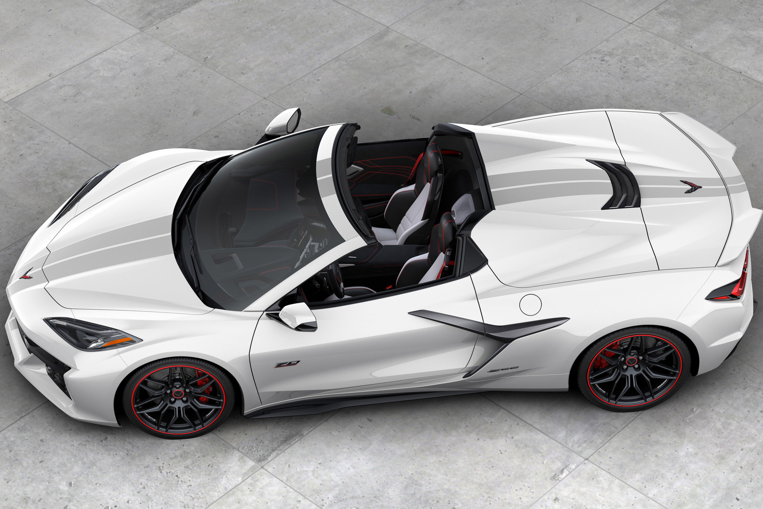 Complementing the special paint and strip combo are distinct alloy wheels with commemorative center caps. While the Stingray and Z06 will each have their own wheel designs, both will share a similar dark finish and Edge Red stripe.