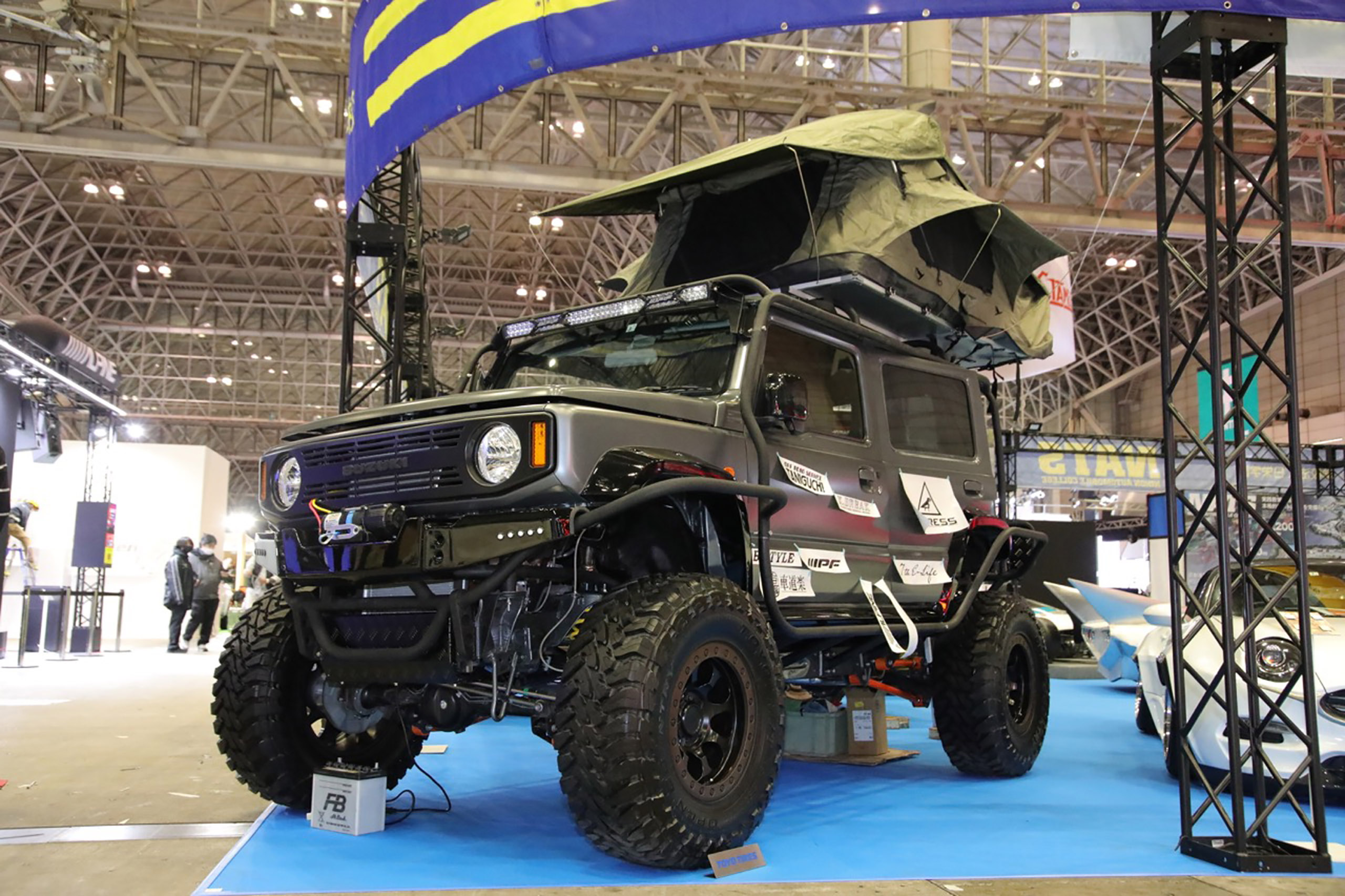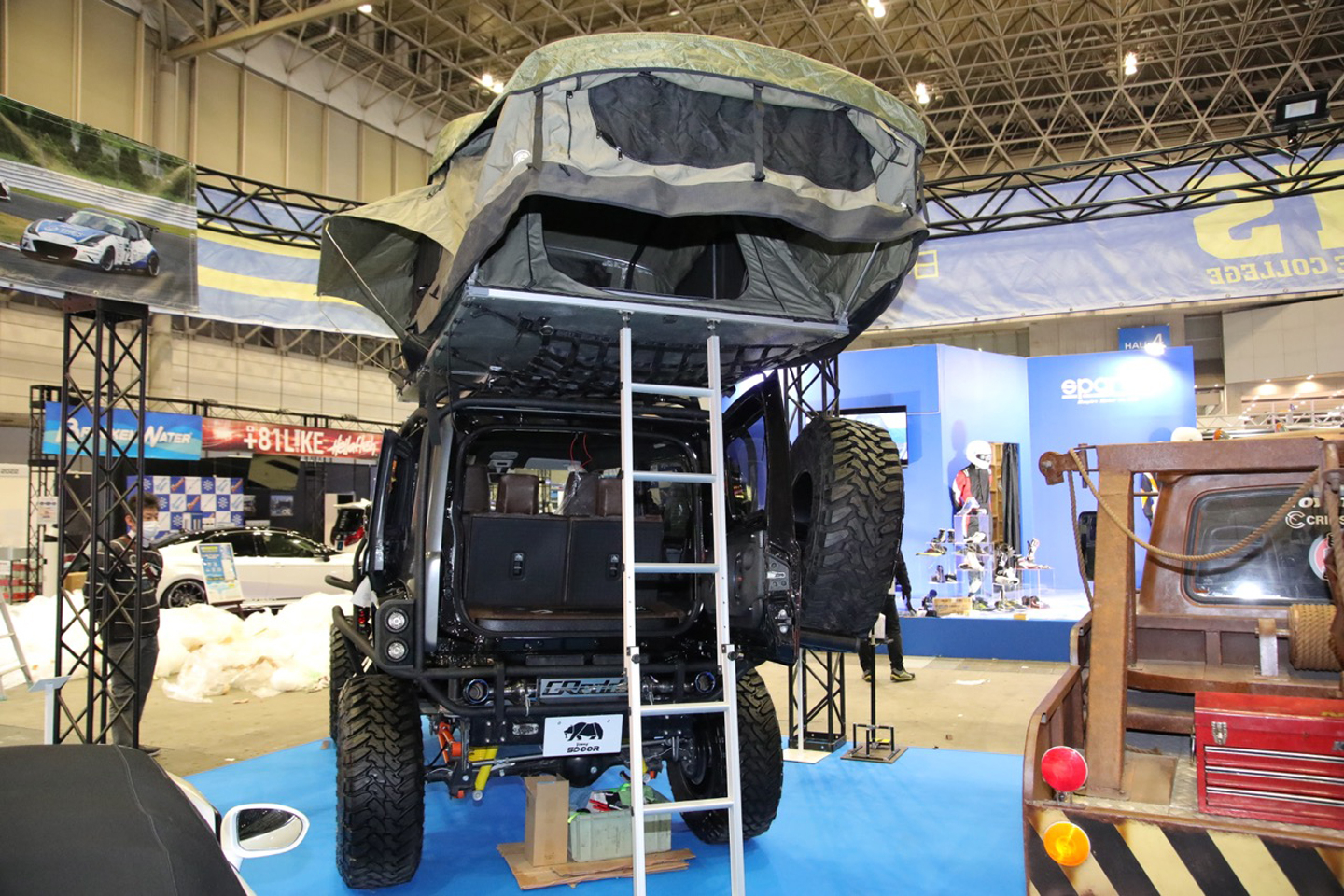Aside from the extra pair of doors, the NATS 5-door Jimny has been lifted by 6 inches and rides on a chunky set of 35-inch tires wrapped on 17-inch wheels. There’s also an outer roll cage to protect the SUV and a tent on top of the roof. The drivetrain also received an upgrade. According to the spec sheet, the Jimny’s 1.5-liter inline-four has been turbocharged and now produces 125 PS with 179 Nm torque. Other interior upgrades include an Alpine head unit for better sound quality.