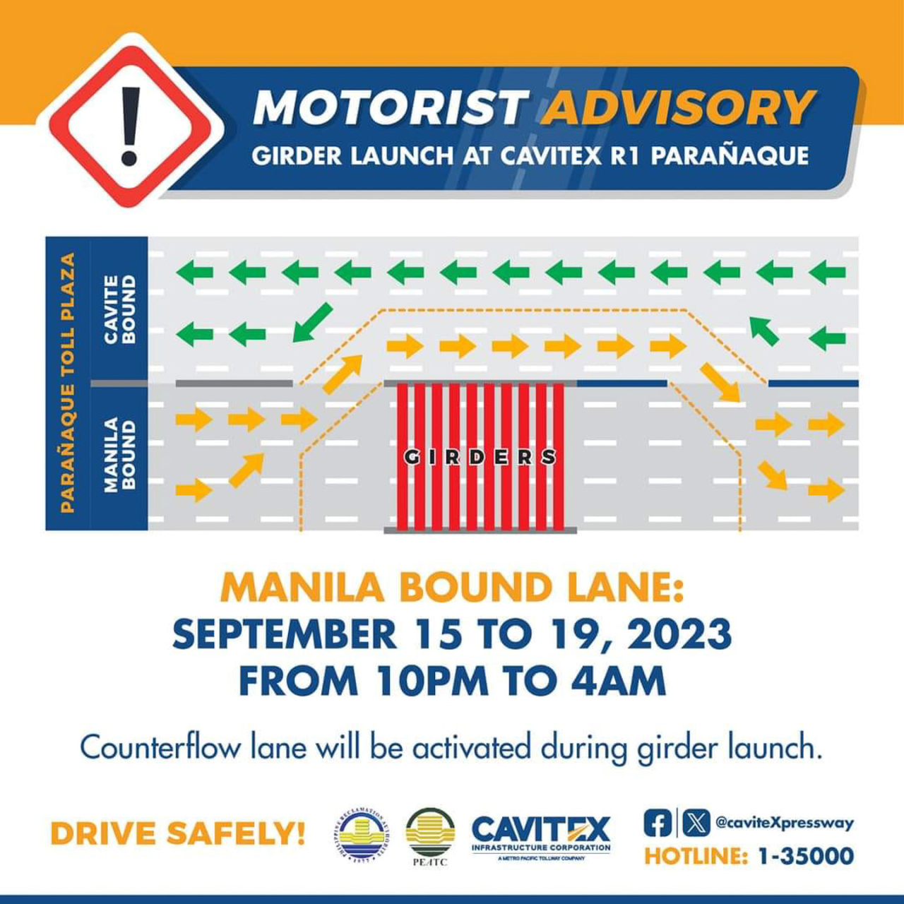 During those times, a counterflow lane in the affected area will be opened on the Cavite-bound side of CAVITEX to allow Manila-bound motorists to pass through.