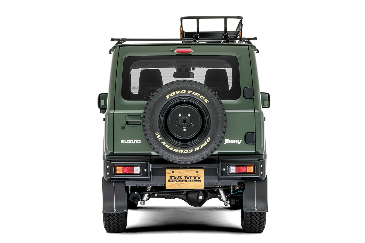 In case you haven't noticed them yet, the tricked-out Jimny also comes with huge side mirrors for added rear visibility. There are also new lower moldings, a distinct camel decal on the doors, mud flaps, and DD emblems finished in black. While not fitted as standard, DAMD fitted the Little G Traditional with a roof rack complete with wood accents.