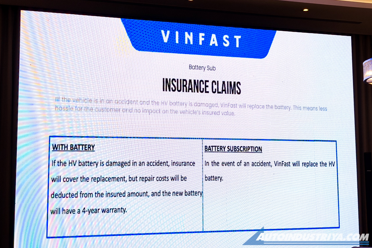 Over to insurance, if the battery is damaged in an accident, insurance can cover the replacement, but repair costs will be deducted from the insured amount, and the new battery will only have a 4-year warranty. With a battery subscription, VinFast will replace the battery in the event of an accident. Speaking of insurance, VinFast says the battery subscription program translates to lower insurance premiums since the battery is not included in the vehicle purchase. This equates to less risk for the insurer and lower cost for the owner.