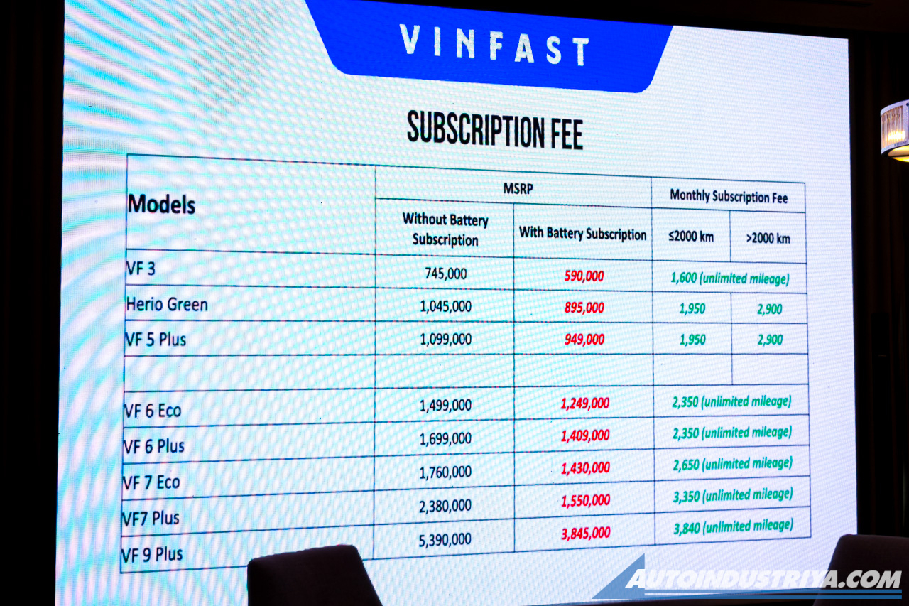 Last but certainly not least, customers who will subscribe will benefit from a lower suggested retail price. For example, the VF 3 will only retail for PHP 590,000 with the battery subscription (PHP 745,000 without). You can check out below the full list of discounted SRP, along with the associated monthly subscription fee.