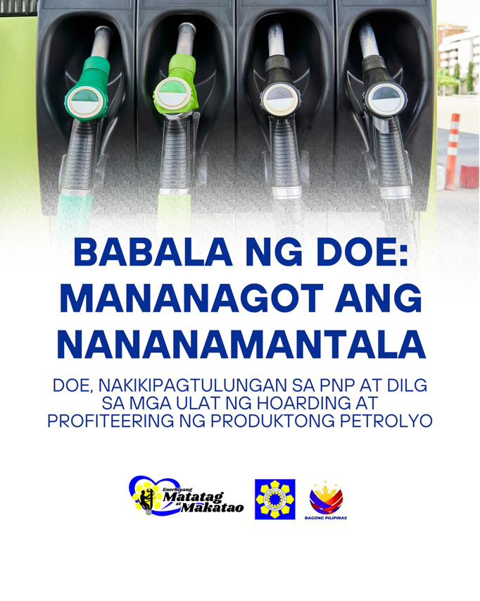 The DOE has also coordinated with the Department of the Interior and Local Government (DILG) and the Philippine National Police (PNP) to ensure immediate action against anyone found violating the law. Reports from DOE field offices in Luzon and Mindanao are currently being verified as part of the case build-up for possible enforcement action.