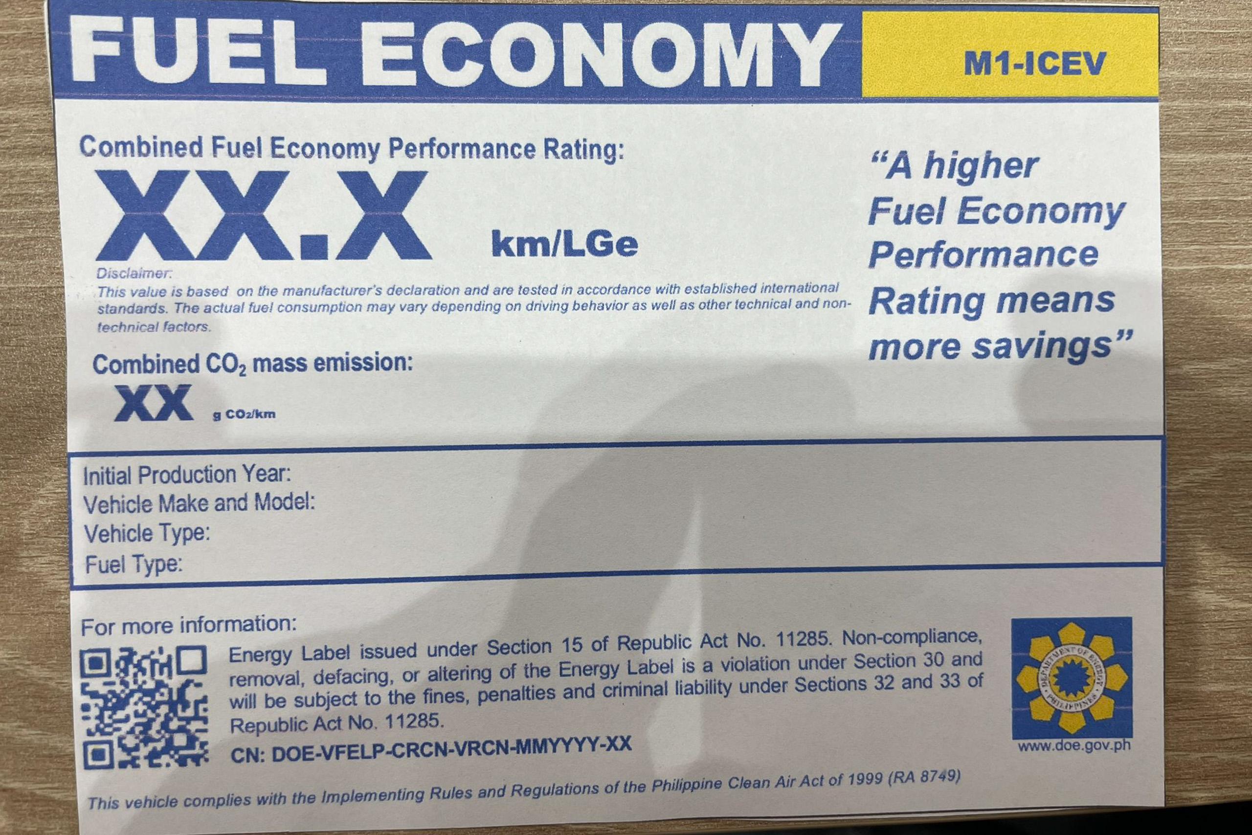 The tags are made to feature the combined fuel economy performance rating as declared by the manufacturer along with the CO2 emitted by the vehicle per kilometer. Based on the sample sticker, the fuel economy rating should be tested in accordance with established international standards. DOE is yet to specify which international standard will be followed, but we’re likely to see manufacturers use the WLTP cycle.