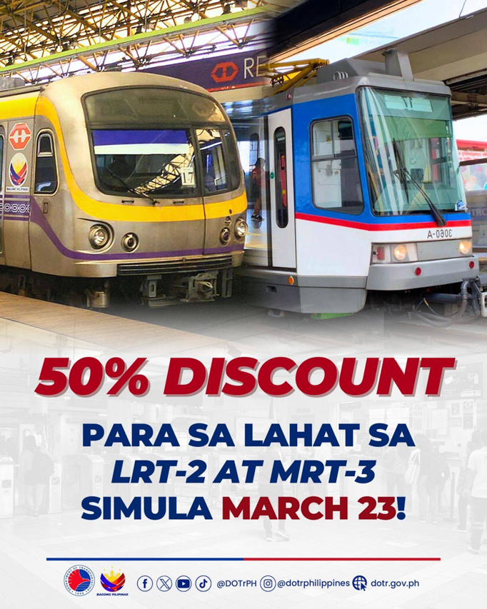 The Department of Transportation (DOTr) has announced a 50% fare discount for MRT-3 and LRT-2 commuters “to ease the burden on commuters.” The MRT-3 runs along EDSA, while the LRT-2 connects Recto Avenue in Manila to Masinag in Antipolo City.