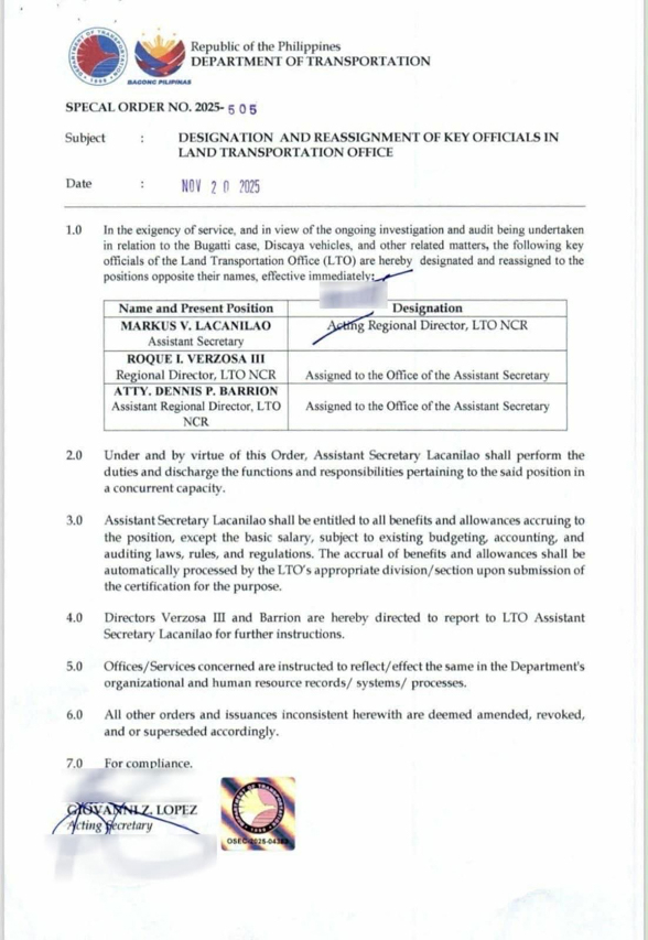 “In the exigency of service, and in view of the ongoing investigation and audit being undertaken in relation to the Bugatti case, Discaya vehicles, and other related matters, the following key officials of the Land Transportation Office (LTO) are hereby designated and reassigned to the positions opposite their names, effective immediately.”