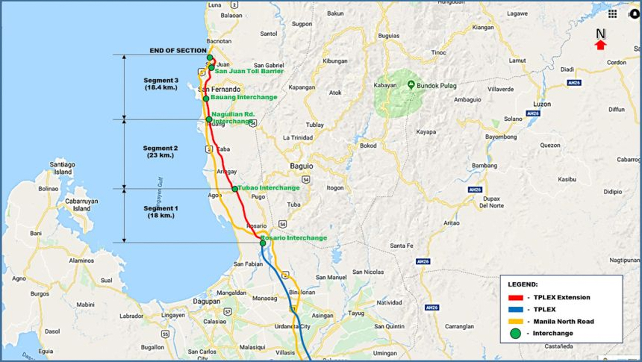 The project will be built in 3 segments: 18 kilometers between Rosario and Tubao for Segment 1; 23 kilometers between Tubao and Naguilian for Segment 2; and the last 18.4 kilometers between Naguilian, Bauang and San Juan for Segment 3.