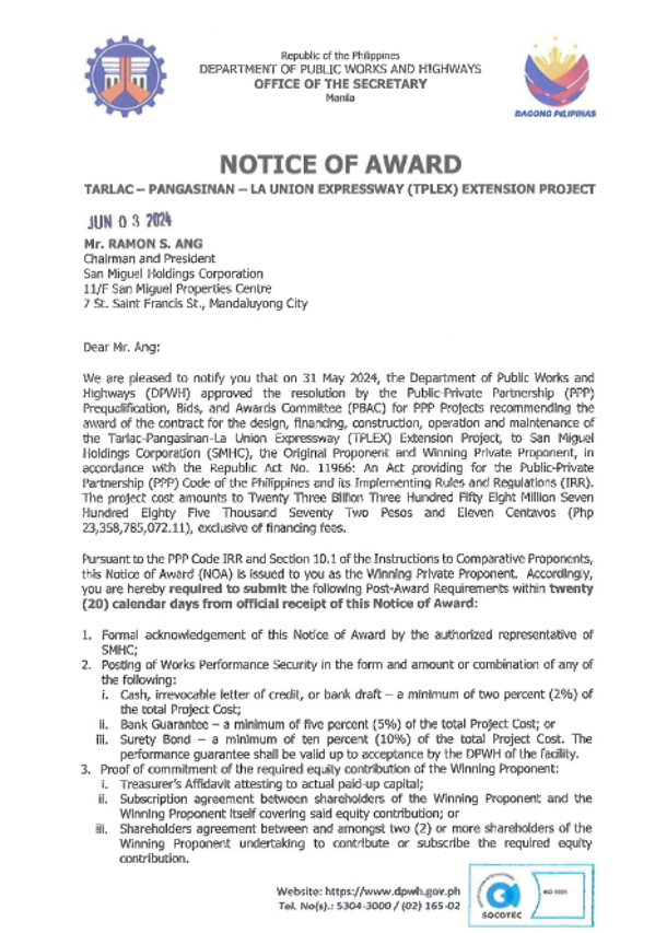“The Department of Public Works and Highways (DPWH) approved the resolution by the Public-Private Partnership (PPP) Prequalification, Bids, and Awards Committee (PBAC) for PPP Projects recommending the award of the contract for the design, financing, construction, operation and maintenance of the Tarlac - Pangasinan - La Union Expressway (TPLEX) Extension Project, to San Miguel Holdings Corporation (SMHC), the Original Proponent and Winning Private Proponent.”