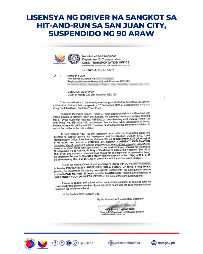 Staying true to its commitment to promoting road discipline by automatically suspending erring motorists, the Department of Transportation (DOTr) and the Land Transportation Office (LTO) have ordered a 90-day suspension of the driver’s license of the motorist linked to a hit-and-run incident in San Juan City.