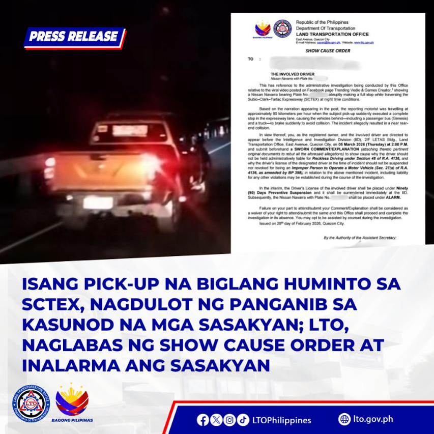 UPDATE: As of 6:15 PM, March 4, 2026, the LTO has issued a show-cause order to the driver who stopped in the middle of NLEX and has suspended their driver's license for 90 days.