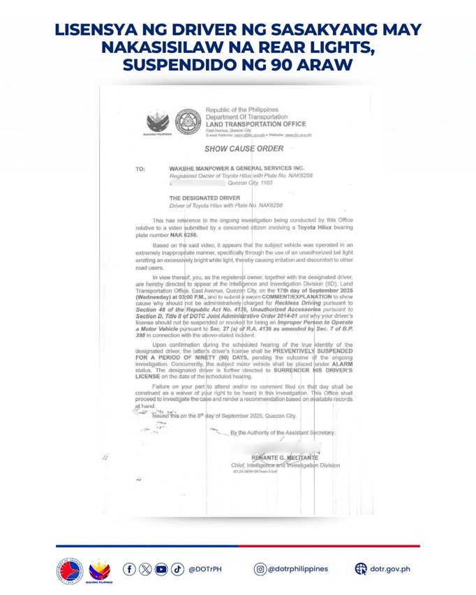 In a Show Cause Order issued by the agency, both the registered owner and the driver were summoned to explain the violation. The LTO said the motorist may face charges of Reckless Driving, Unauthorized Accessories, and Improper Person to Operate a Motor Vehicle. The move follows mounting complaints from the public about vehicles with blinding lights, which have been flagged as road hazards, particularly at night.