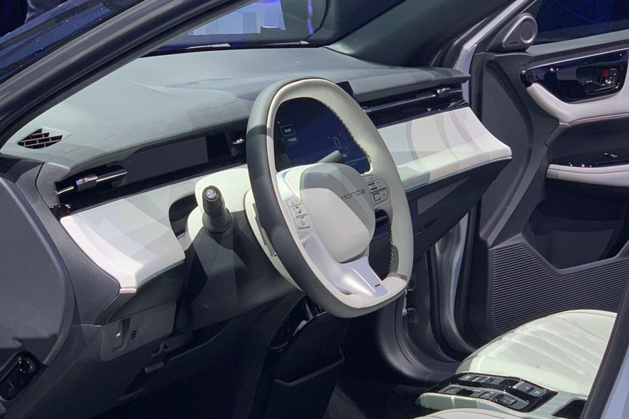 Inside, the e:NP2 has a combination of black panels with white upholstery. While the e:NP1 had a reworked version of the HR-V's dashboard, the e:NP2 features a completely new design with a letterbox instrument panel and a landscape-oriented infotainment touchscreen. The steering wheel also has a different design, and the space that's usually occupied by a transmission tunnel has been freed up in the middle.