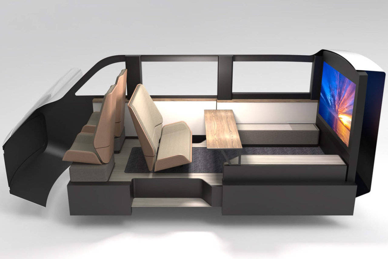 But inside, there’s a massive 65-inch screen that comes with swiveling rear seats for that whole mobile living room experience. Sharp says the cabin adopts technology from its home applicances for its adaptive climate control settings and screen brightness. Furthermore, Sharp’s AI technology will see extensive use in the EV minivan for further personalization.