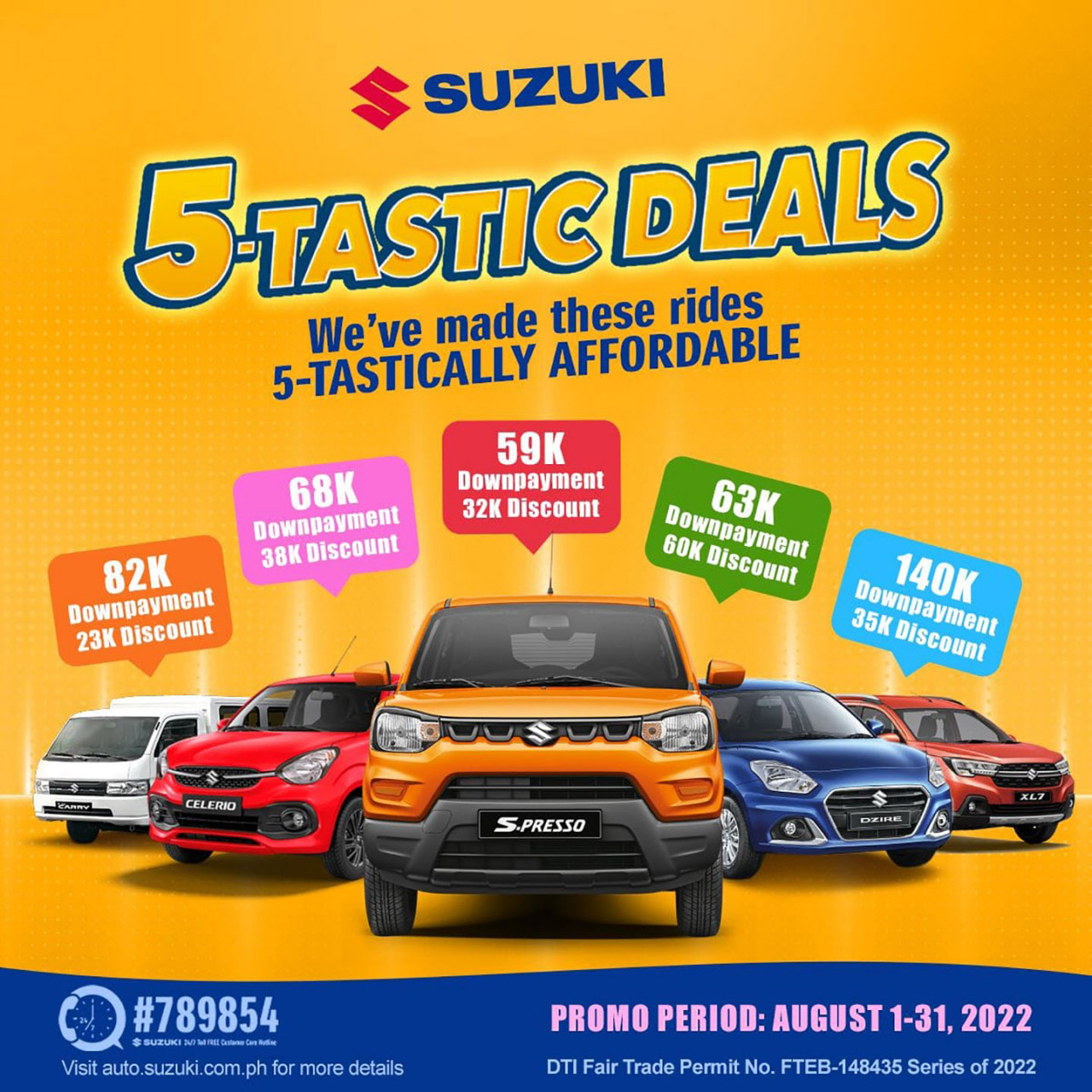 Fuel efficiency matters now more than ever, and Suzuki Philippines will deliver just that with the added style, practicality, and functionality of their compact vehicle offerings. Enjoy fuel-efficient driving now with Suzuki! Visit your nearest dealership or check out their virtual showroom at http://auto.suzuki.com.ph/ for more details. For the month of August, Suzuki is offering special deals on the all-new Celerio (discount of Php 38,000 or low downpayment of up to Php 68,000), S-Presso (low downpayment of up to Php 59,000 and/or a cash discount of Php 32,000), and Dzire (cash discount of up to Php 60,000 or low downpayment of up to Php 63,000).