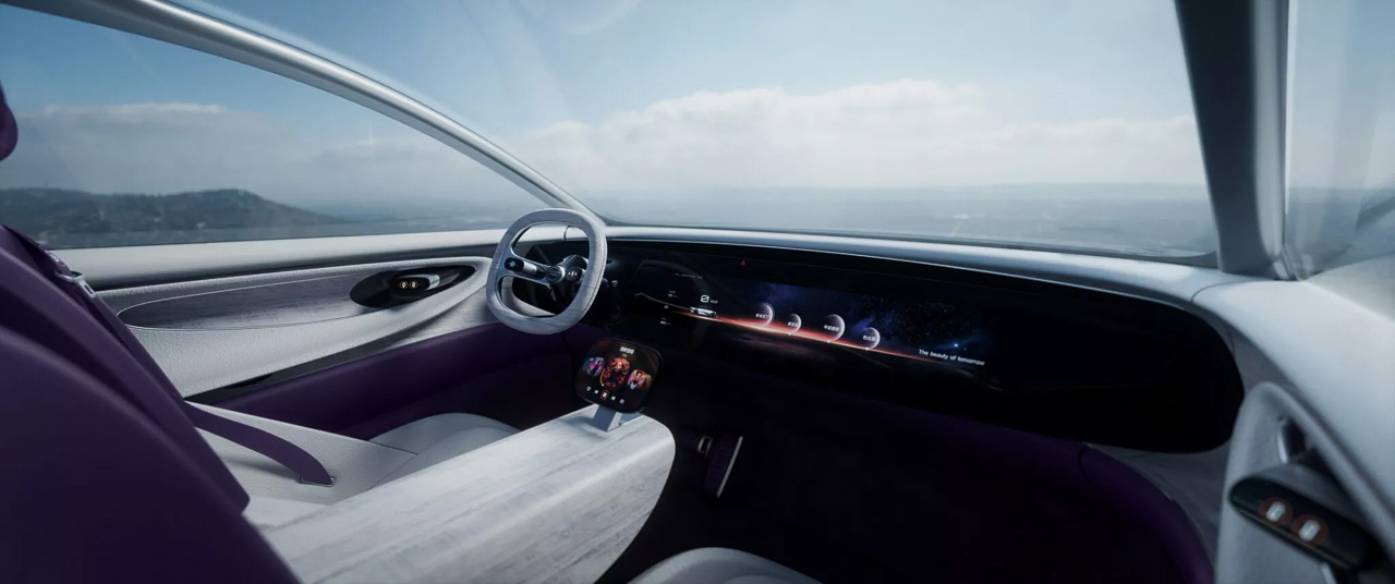 The cabin itself is covered in bio-based mycelium leather upholstery and has suede-like surfaces with white wood-like textures. Last but not least, the dashboard itself comes with a large screen that serves as the vehicle's onboard infotainment system.