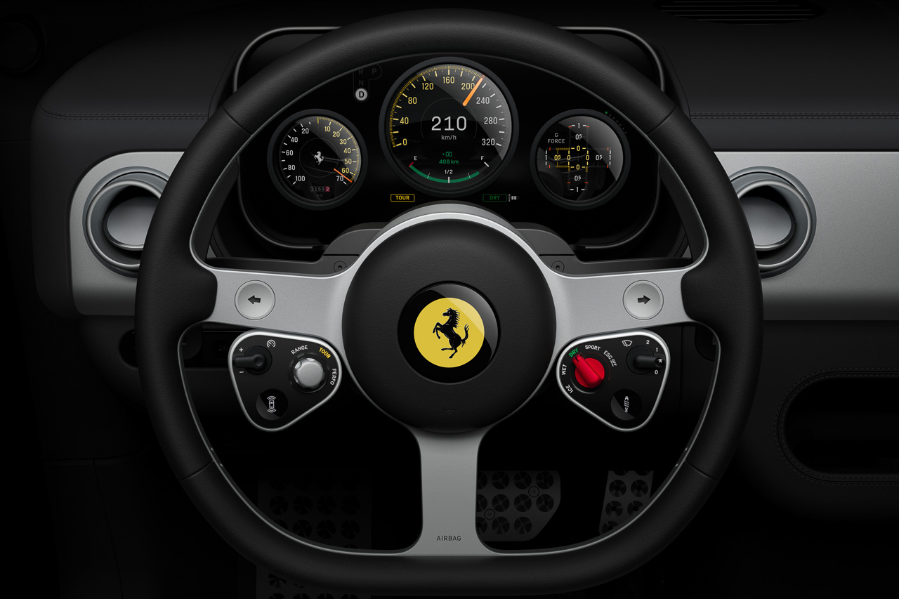 The simple yet classic look, combined with the exposed aluminum, immediately catches your attention, along with the flat-bottom design. A total of 19 CNC-machined parts make the Luce's steering wheel lighter than a typical Ferrari steering wheel, but it still comes with controls for the driver to use. These include the signature “manettino” dial, wiper controls, turn signal buttons, cruise control, drive modes, parking sensors, and even a button to set the suspension settings.